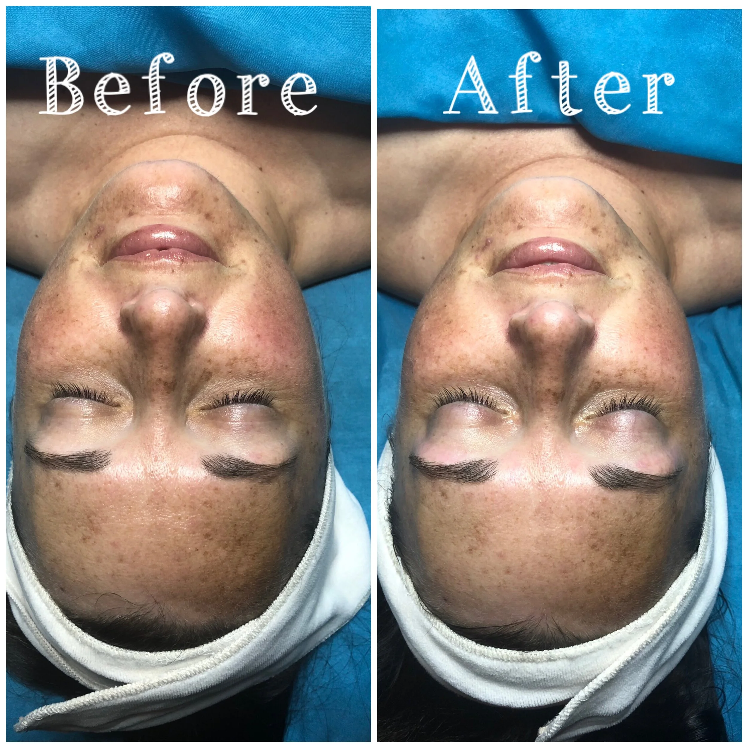 Client received the Cherry Brightening Facial, loaded with lactic acid and kojic acid to brighten stubborn pigmentation. Visible reduction in pigmentation after even just one treatment.